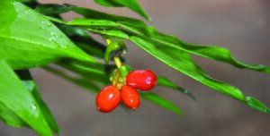 ผลแบบผลมีเนื้อหนึ่งถึงหลายเมล็ด ช่อผลมี ๑-๕ ผล ผลคล้ายรูปกระบองกลับ ทรงรูปไข่ หรือ รูปทรงรี กว้าง ๑-๑.๔ ซม. ยาว ๑-๑.๘ ซม. สีเขียว สุกสีแดง พบบ่อยที่โคนผลมีกลีบรวมบางคล้ายกระดาษ ติดทน มีเมล็ด ๑ เมล็ด พบน้อยที่มีได้ถึง ๓ เมล็ด